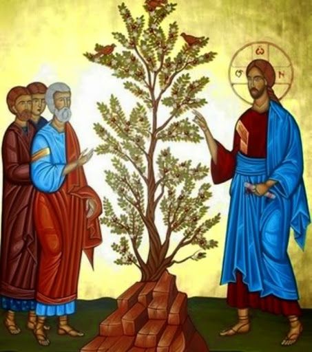 Il granello di senape, che cresce fino a diventare un albero e su cui gli uccelli del cielo possono posarsi, è presentato nella sua valenza simbolica, che trova in questa icona una chiara rappresentazione. L’albero di senape è posto al centro, poggiando sulla roccia segno di Cristo, simboleggia la fede che inizia in modo piccolo ma cresce fino a diventare qualcosa di grande e potente.