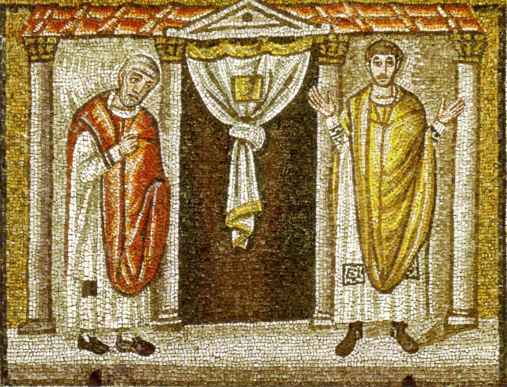 La parabola evangelica è stata rappresentata sin dalle origini, come nel mosaico nell’abside della chiesa di S. Apollinare Nuovo a Ravenna (databile intorno al VI sec.). I due protagonisti del racconto evangelico sono posti davanti ad un tempio sormontato da un frontone con oculus e sorretto da quattro colonne. Il contrasto tra i due personaggi è evidente nella rappresentazione musiva. Guardando la scena l’uomo a sinistra è il pubblicano, indossa vesti dimesse, è volto di tre quarti; non osa alzare il capo, tenendolo reclinato verso il centro della scena riconoscendosi peccatore, mentre con la mano destra si batte il petto, in segno di umiltà. A destra, invece, è raffigurato il fariseo, ritto in posizione frontale, indossando abiti raffinati, come una tunica bianca ricamata alle estremità delle maniche e nella parte inferiore. E’ nell’atteggiamento dell’orante, come si usava nell’antichità, sia per gli ebrei che per i primi cristiani, con gli avambracci alzati e allargati e il palmo delle mani aperto; il suo sguardo è diritto e sembra ostentare superbia.