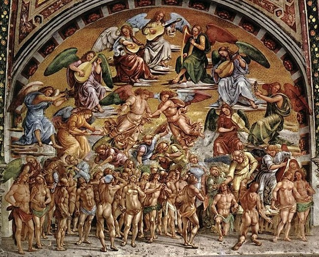 L’invito alla vigilanza che risuona in questa prima domenica di Avvento ci porta a considerare la realtà del giudizio universale. Per questo mi fermo a contemplare la scena degli eletti in Paradiso così come la rappresenta Luca Signorelli, uno dei grandi interpreti del Rinascimento, nel grande affresco sul lato sinistro della Cappella di san Brizio nel Duomo di Orvieto (databile tra il 1501 ed il 1502) che fa parte  del complesso del Giudizio universale, con la Risurrezione di Gesù, il Paradiso e l’Anti inferno  Una porzione di arco in prospettiva, decorato con cassettoni dipinti che fingono il rilievo, riquadra la scena. In basso sono raffigurati gli Eletti, seminudi, in atteggiamento estatico, che sembrano essere attratti verso l’alto da un moto che parte dall’angolo inferiore sinistro per arrivare a quello superiore destro. Sopra di loro gli Angeli guidano gli Eletti; essi, infatti, sembrano sollevarsi gradualmente da terra e ascendere al cielo stellato, ove sono attesi da altri Angeli volanti (a destra e a sinistra), i quali, imbracciando strumenti a corda e a fiato, appaiono intenti a suonare.
